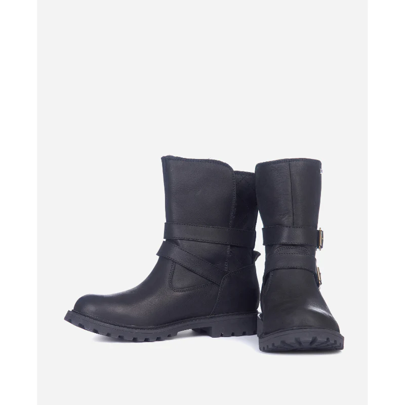 Barbours Sycamore Ladies Waterproof Boot is a mid-high winter boot with luxurious faux fur lining for warmth and supreme comfort. Fully waterproof and engineered on a chunky, cleated outsole for stability. Finished with stylish Barbour branded dual buckle detail.