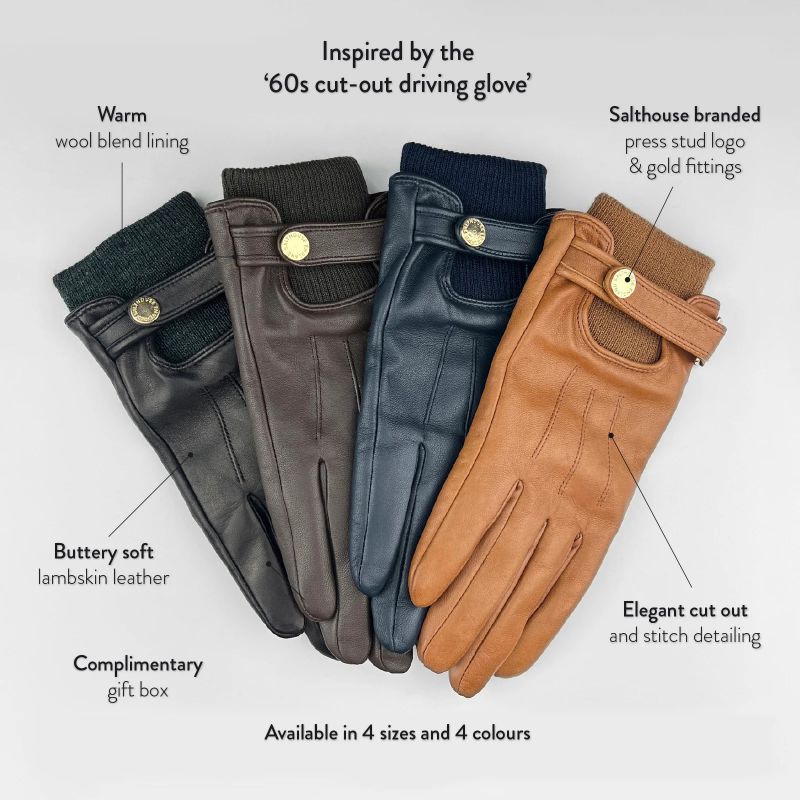 The Salthouse England Elektra Ladies Leather Gloves are a super stylish and feminine accessory to keep you warm and cosy this winter. Inspired by classic driving gloves, the Elektra are handcrafted from luxuriously soft and supple lambskin leather with a wool blend lining for added warmth and comfort. Featuring exposed stitching and leather wrist strap with subtly branded press stud fastening, these gloves provide so much more than just practicality and will perfectly complete your chic winter outfit.
